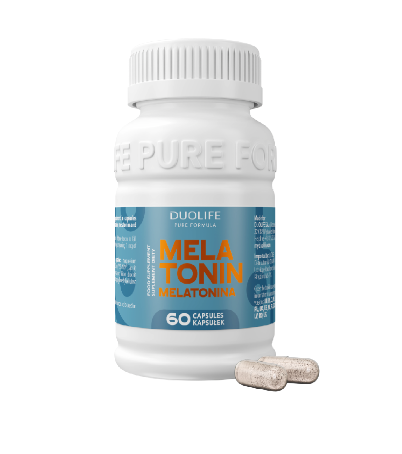 DUOLIFE Melatonina to suplement diety z linii Pure Formula zawierający melatoninę zamkniętą w kapsułkach z organicznej pochodnej celulozy (HPMC) o opóźnionym czasie uwalniania.