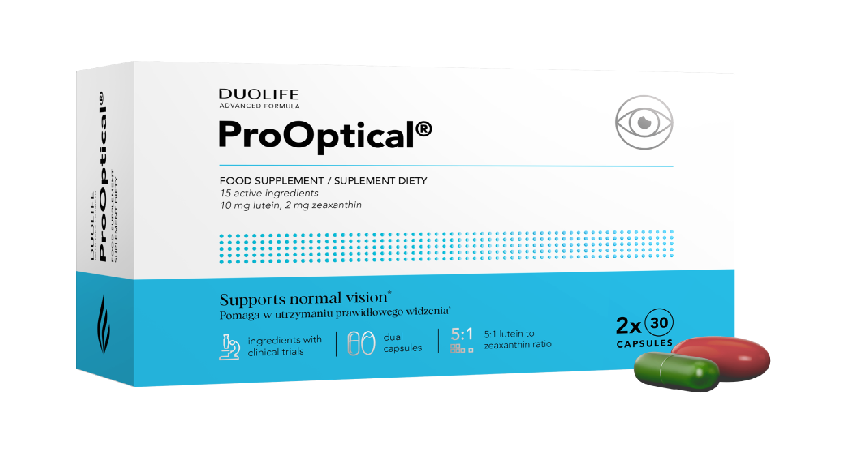 ProOptical® to suplement diety złożony z 2 uzupełniających się kapsułek. Preparat zawiera cenne składniki aktywne zamknięte w 2 rodzajach kapsułek: miękkiej typu „softgel” i twardej.